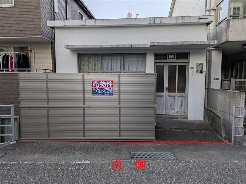 南側、鉄筋コンクリートブロック造陸屋根2階建 延べ床面積69.41㎡と北側、木造鉄骨2階建て未登記物件の上物有り 現状渡し