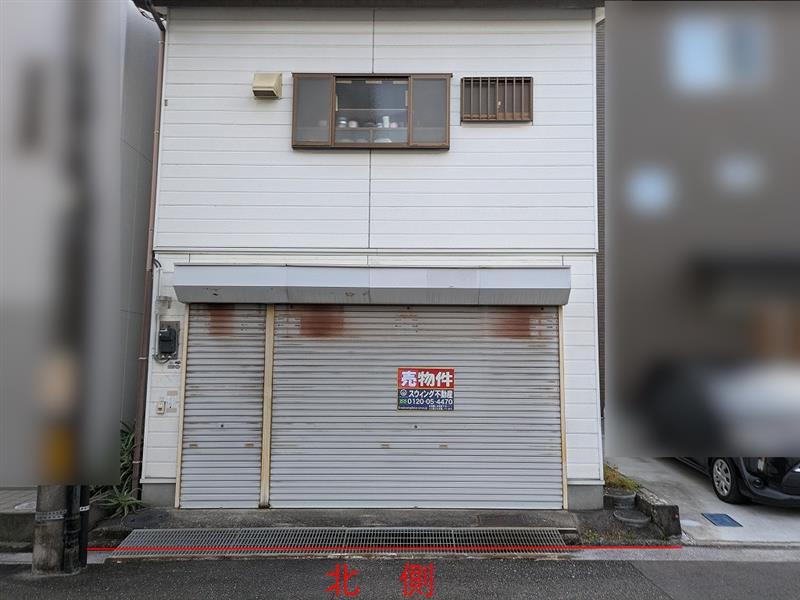 南側、鉄筋コンクリートブロック造陸屋根2階建 延べ床面積69.41㎡と北側、木造鉄骨2階建て未登記物件の上物有り 現状渡し